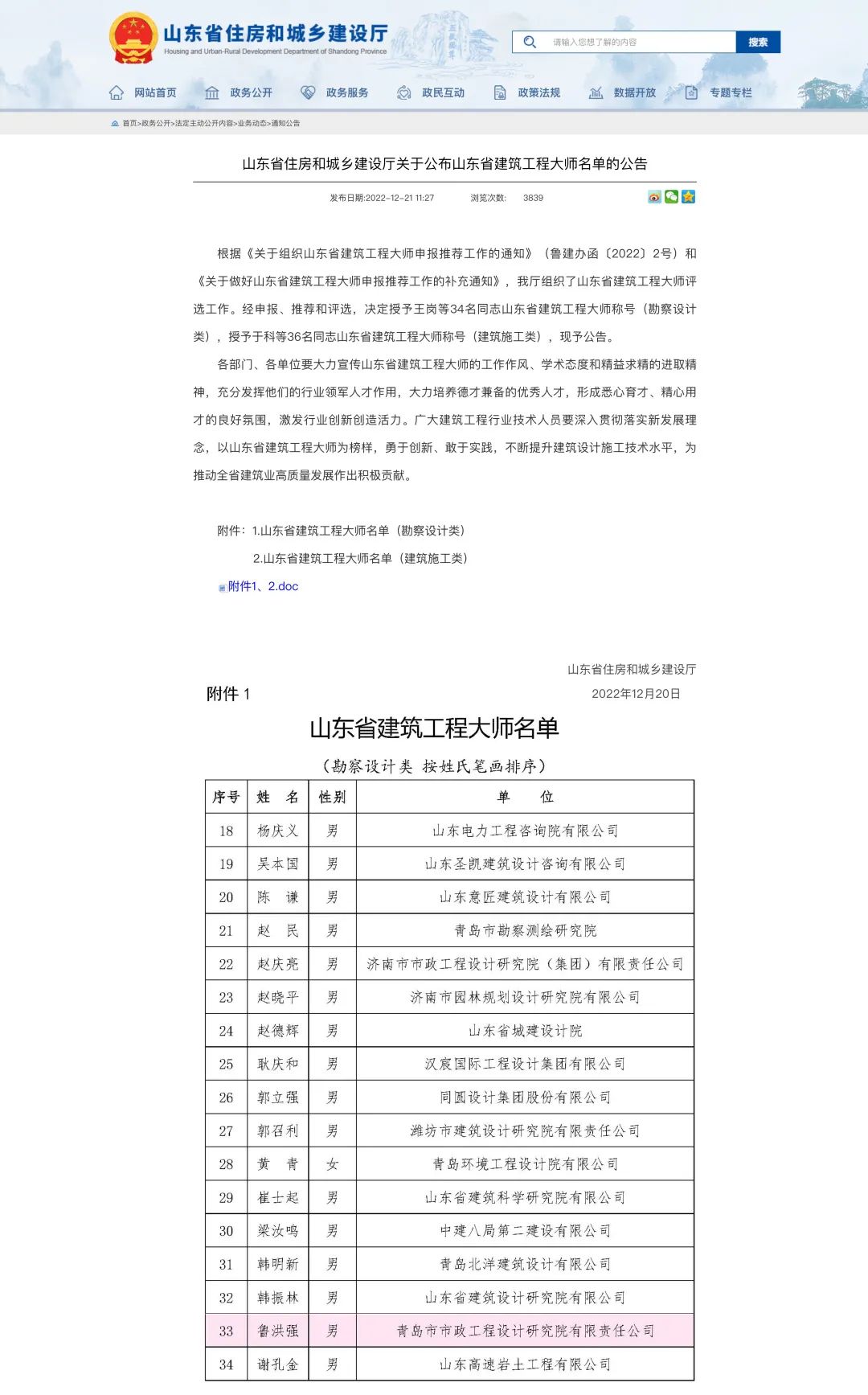 近日,山东省住房和城乡建设厅公布山东省建筑工程大师评选结果,我院鲁洪强同志荣膺勘察设计类“山东省建筑工程大师”称号。